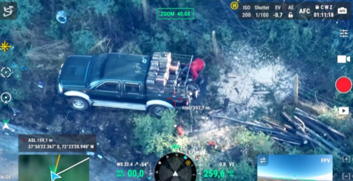 The first incident was recorded at kilometer 558 of Route 5, where the CMPC drone, operated by the company's security personnel, spotted a man loading acacia wood chips into a green pickup truck. After an alert was sent to emergency number 133, officers from the 2nd Mulchén Police Station arrived at the scene, confirming the crime and arresting the individual, identified as J.A.C.U., aged 60.